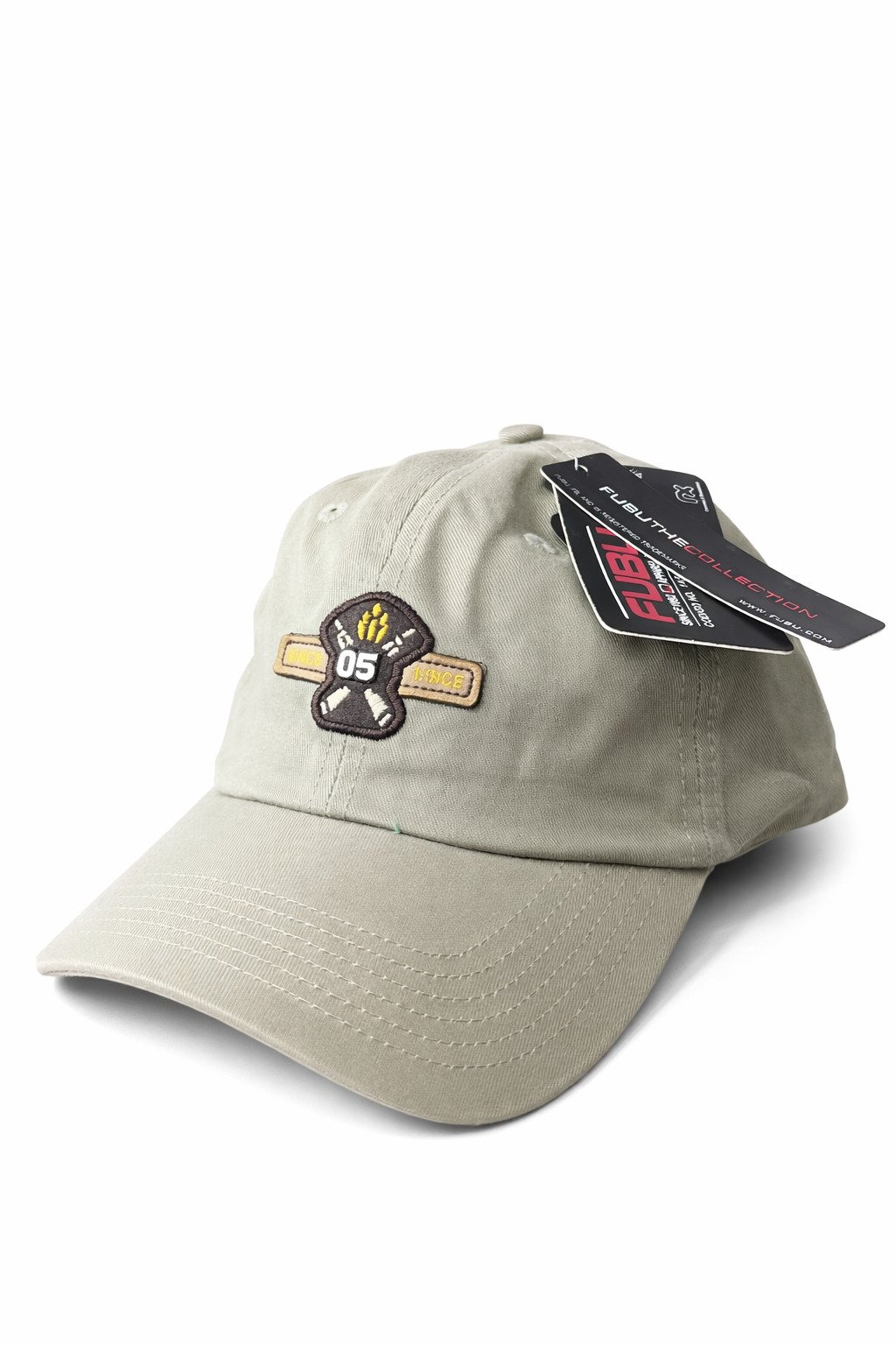 A stylish light beige baseball cap from the Fubu Future Collection, featuring a detailed embroidered “05” patch with signature accents on the front. Made from durable cotton with a curved brim and adjustable strap, this cap offers a comfortable fit and a clean streetwear look perfect for everyday wear.